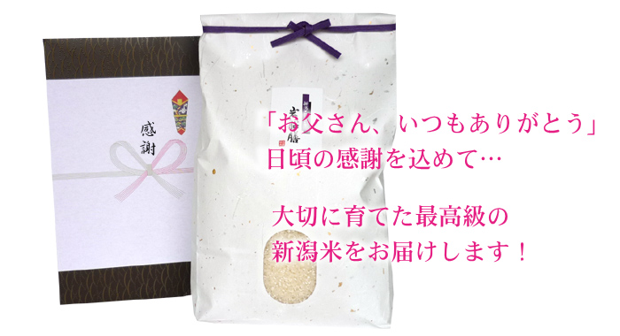 父の日のプレゼントに安全で安心、美味しい新潟米を贈りませんか?新潟県北部の山間部で栽培される最高級コシヒカリをお届けします。地理的条件に恵まれ、経験豊富な農家によって大切に栽培されたお米は正に一級品!お米はどなたが受け取って嬉しいギフトですよね。「お父さん、いつもありがとう」「元気に頑張ってね」の気持ちを込めて、ちょっとリッチなお米をプレゼントしませんか?きっと喜んでくださるはずです。
